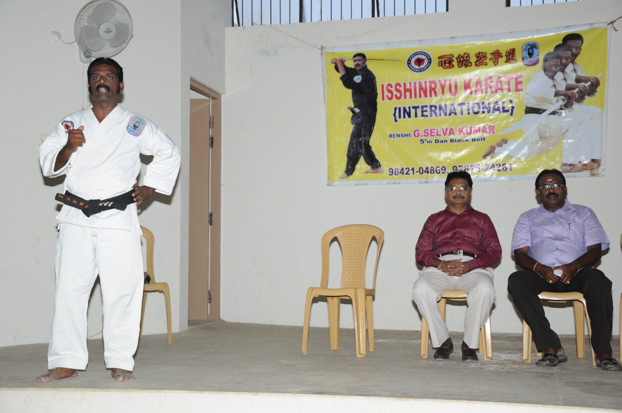 Renshi Selvakumar,a devoted martial artist all over Tamilnadu, been over 32 years of training and he is a holder 5th dan black belt in Isshinryu karate and a korean kukkiwon taekwondo blackbelt (1st dan)..he is the direct black belt disciple of shihan hussaini.he also obtained a blackbelt in the style of gojuryu too. 心を一つの方法空手、沖縄、槍に勝つ